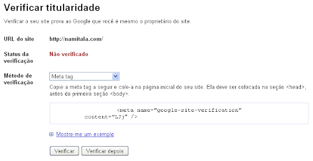 O cadastro é super simples, basta clicar em adicionar um site, colocar a url como no exemplo, copiar a metatag em verificar titularidade colando-a dentro do cabeçalho da sua página.